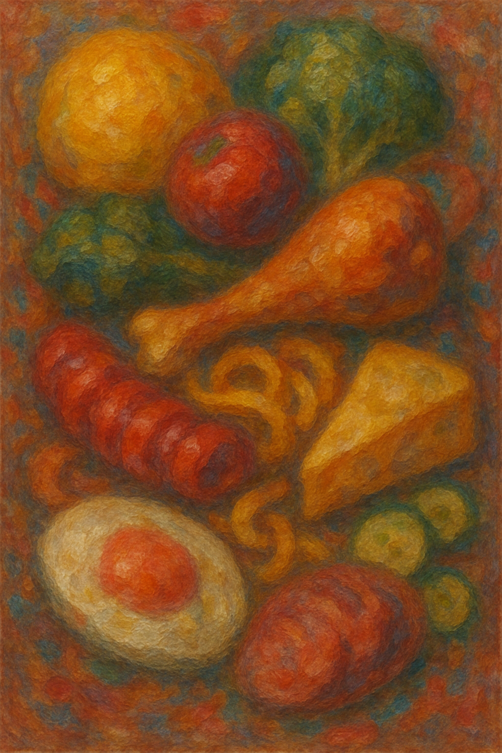 Ragoût bariolé (n.m. locution poétique) : Assemblage hétéroclite et festif, où chaque chose ajoute au tumulte joyeux.