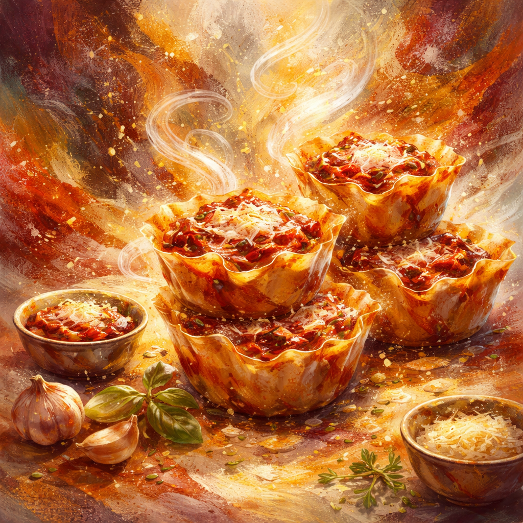 Preheat oven to 375F.  Oil two muffin tin cups and line with one wonton wrapper each.  In a small bowl, mix th cheeses and the ground beef, and season with salt and pepper.  Put 1/3 of the mixture in the bottom of the won’t wrappers, and top with a spoonful of marinara sauce; repeat this two more times, then top with more sprinkles of Parmesan and the mozzarella.  Bake on the center rack in your oven for 20 minutes or until cheese is bubbly.